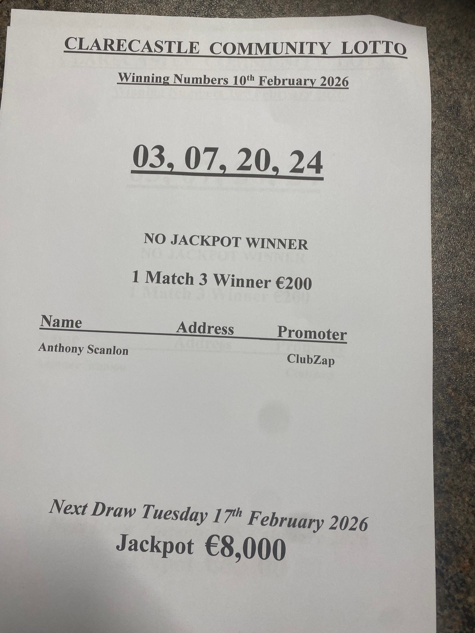 • Clarecastle Community LottoFebruary 11, 2026